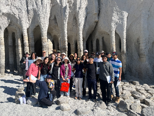 Photos from the pre-year field trip. Clockwise from top left: Prof. Paul Asimow and company—TA Yuri Tamama riding shotgun—on the road to the Coso geothermal plant, students stand in front of the Earthquake Fault on Mammoth Mountain, and the group poses next to the Crowley Lake Columns. (All photos courtesy of Paul Asimow.)