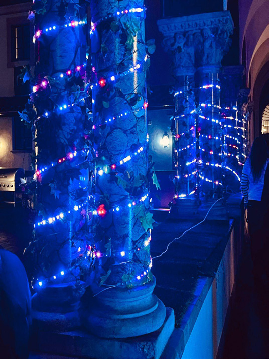 Inside, low lighting and back-lit runic artwork supplied the promised atmosphere, while the DJ booth in the courtyard served as a focal point. The party continued late into the night, testifying to its Norse-mythological allure.