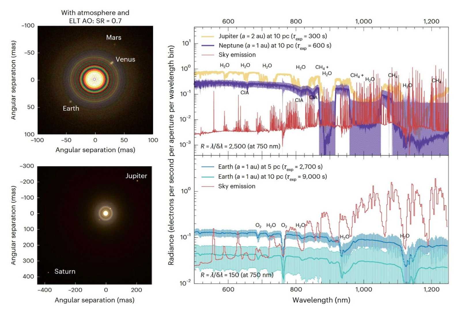 Figure 2 of the paper, which shows we can detect the full solar system through the Earth Atmosphere and ELT AO, including Earth-like Exoplanets in a few minutes and bio-signatures of life (oxygen and water) in a couple hours. (Image: Nature Astronomy)